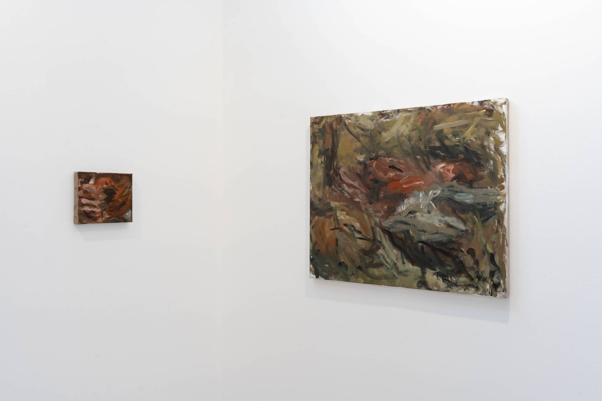 Eleni Tomadaki, I held it with both my hands slowly put it in my mouth and tried to chew it but it was tasteless spongy and wet I could not swallow it, 2025, oil on linen, 130 x 150 cm